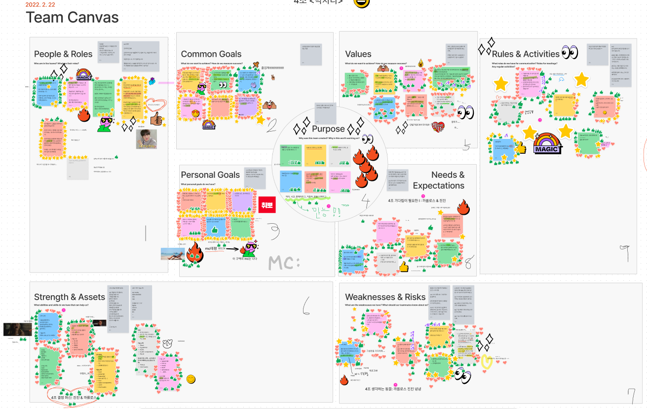 프론트엔드 5분과 디자이너 1명으로 팀이 완성되었고, MC태평의 주도로 팀 캔버스를 채워나갔다. 서로 자기소개와 목표, 가치, 리스크 등 아이디어에 관해 이야기했다. 여기서 리액션이 가장 중요했는데, 회사에서 한번도 안해봤던 반응해주기라니.. 처음엔 조금 어려웠지만 금방 적응했다! 이렇게 1일차는 마무리.