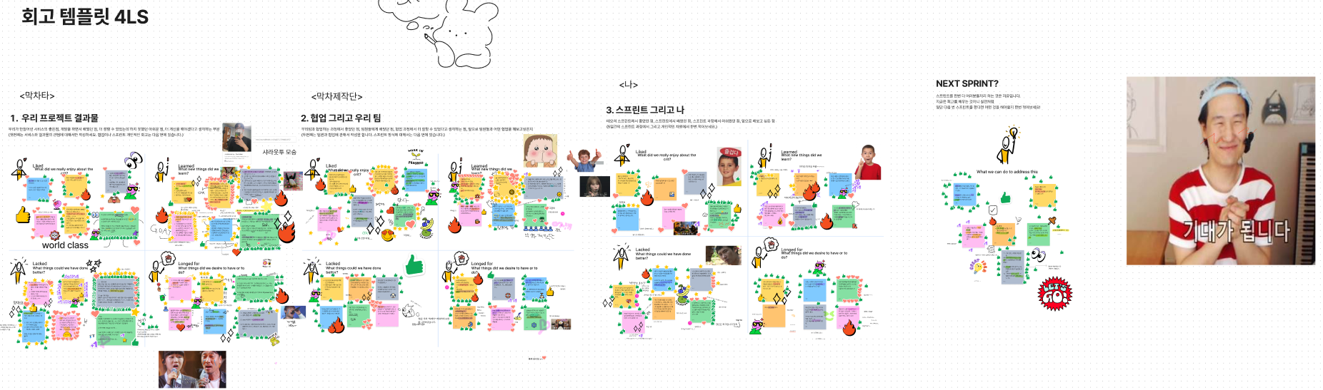 데모발표 이후 마지막 활동으로 회고 템플릿을 통해 스프린트를 정리하는 시간을 가졌다. 사실 일주일도 안되는 시간에 서비스를 만드는 건 힘들다는걸 알고있었지만, 테오가 항상 강조했던 "그럴싸하게 만드는 것"을 잊지 않는것이 중요한 거 같다.