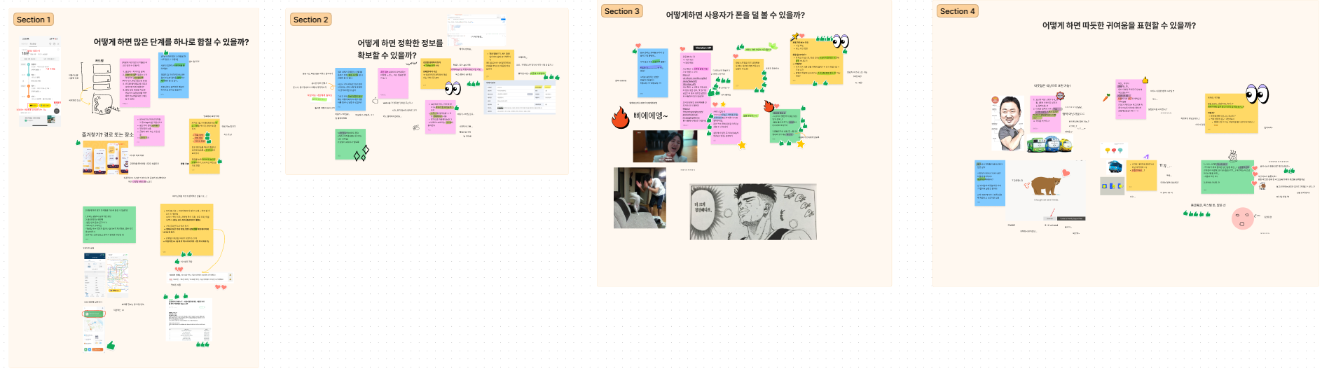 정말 많은 생각들을 분류하고 걸러 4가지에 대해 구체화해보았다. 레퍼런스를 중심으로 아이디어가 요소요소마다 구체화되어서 머릿속에 그려지는게 느껴졌다.