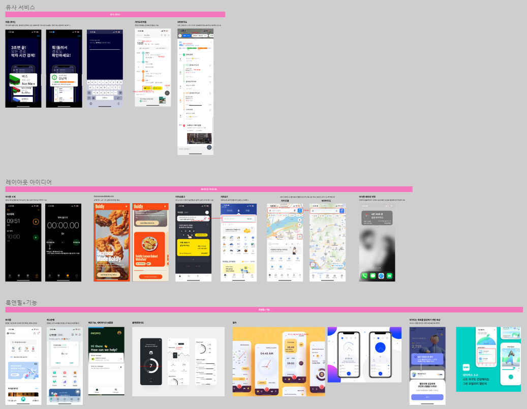 유사 서비스는 다들 비슷하게 해오실거고, 디자이너로서 할 수 있는게 뭐가 있을까 생각하다가 기능에 따른 레이아웃 아이디어, 룩앤필을 추가했다. 이렇게 숙제는 끝.